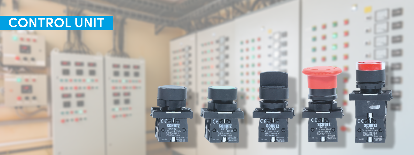Schutz can offer a complete range of Push buttons with and without indication , Emergency stop buttons , Double head push Buttons , multiposition selectors knob with and without Key operated in plastic and metal versions.